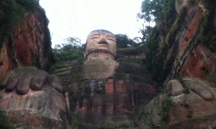 Leishan, petite ville où nous irons voir le Bouddha Géant, ville qui en fait dépasse encore le million d’habitants. A croire que les petits villages comme chez nous n’existent pas, car même sur la route on en voit pas tant que ça. Nous accédons au parc où se trouve la statue de buddha, excentré de la ville, dans un paysage plus sauvage, nous grimpons à travers la nature, sur le chemin nous verrons une très jolie pagode puis nous cherchons Buddha. Nous ne savons pas exactement encore à quel point il est grand, nous savons juste que c’est la plus grande représentation de Buddha au monde. Nous le réaliserons vite quand nous tomberons face à sa tête. Il est très imposant et magnifique, il mesure 71 mètres de haut. Il se fond bien dans la nature, il est creusé dans une falaise de pierres, et conservé en l’état. D’ailleurs, il commence à s’abîmer mais ils ne savent pas trop encore comment le restaurer sans prendre le risque de l’abîmer davantage. Nous le verrons de haut, puis nous descenderons en bas de la falaise pour le voir tout entier. Nous le contemplons un bon moment avant de prendre le chemin de la sortie car la journée n’est pas terminée. Commentaire : Les paysages sont très beaux, une végétation luxuriante très dense et humide, dans un relief montagneux, une rivière coule à travers la forêt. Les temples qui sont édifiées dans la montagne se fondent dans le paysage et font de cet endroit un lieu agréable et apaisant. Nous trouverons de beaux temples sur le chemin, qui nous servent également de petite pause car les marches sont raides et nous faisons un bon paquet de kilomètres. Suite de notre voyage en Chine : Leshan et le Mont Emei